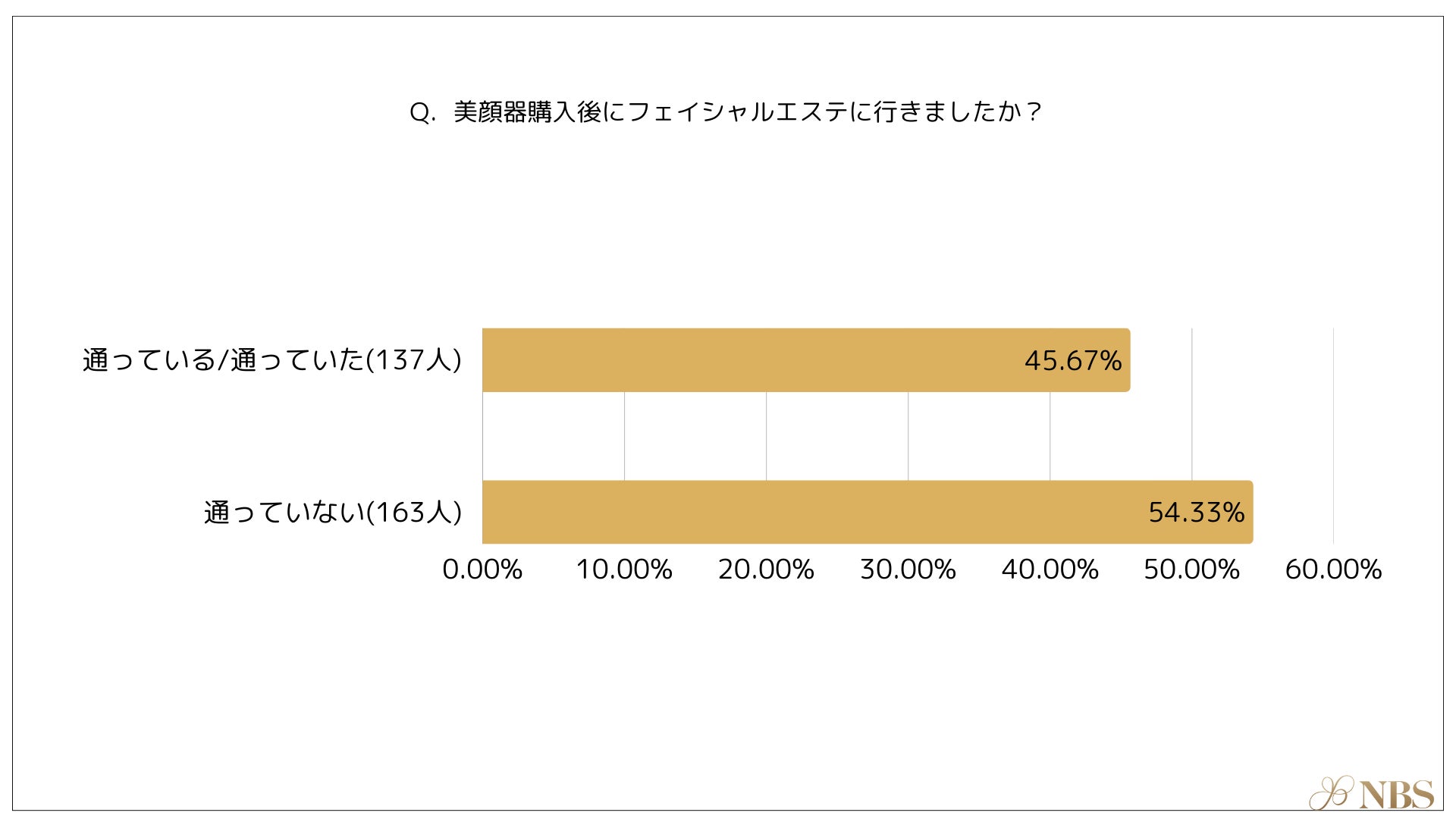 「美顔器購入後にフェイシャルエステに行った方」は45.67%、「美顔器購入後にフェイシャルエステに行っていない方」は54.33%という結果になりました。