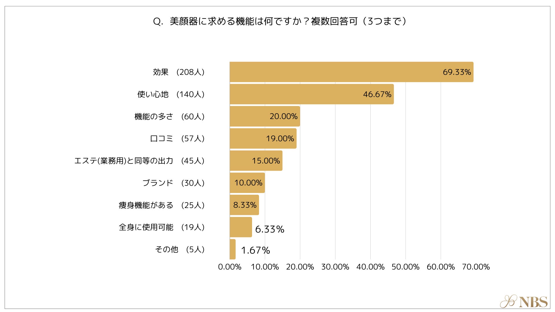 株式会社NBSでは20~60代の美顔器(フェイスローラーを除く)を自分のために購入した経験のある女性、計300名を対象に、美顔器に関する意識調査を実施しました。
