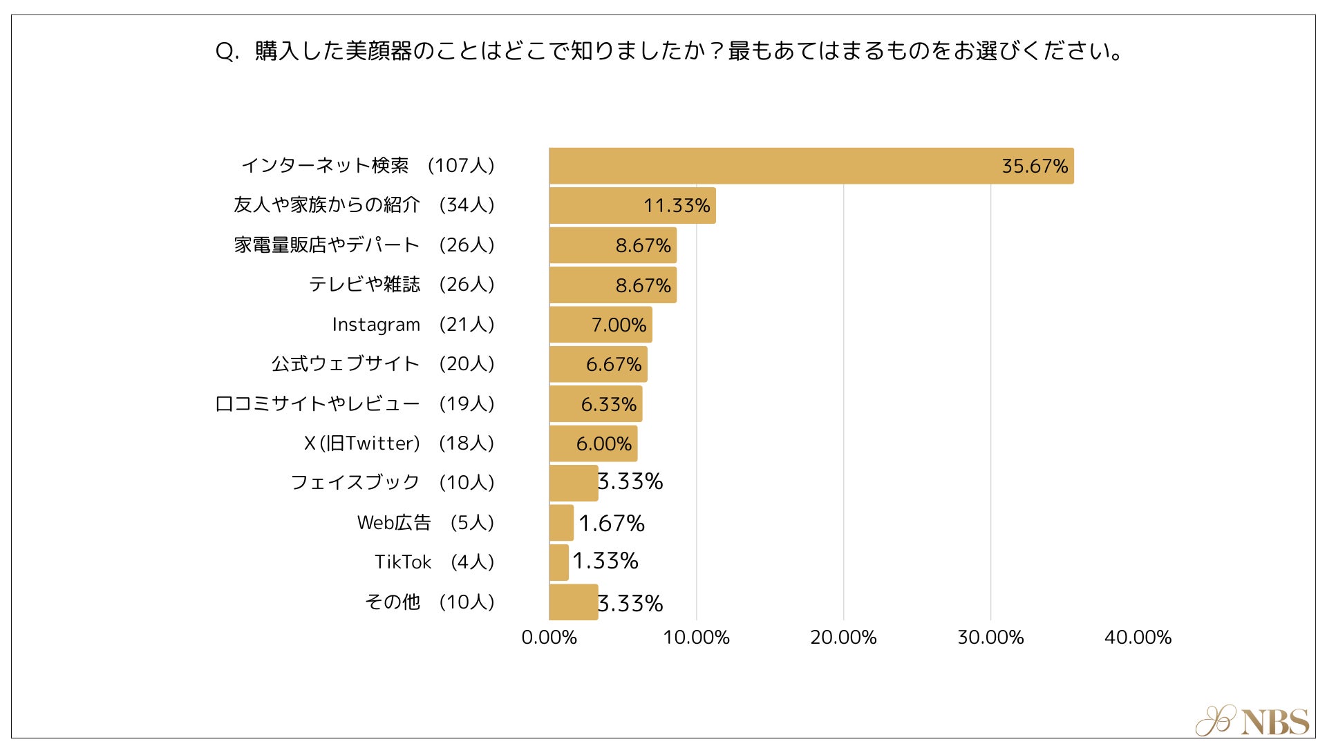 購入した美顔器を知ったきっかけとして最も多かったのは、「インターネット検索(35.67%)」次いで「友人や家族からの紹介(11.33%)」という結果になりました。