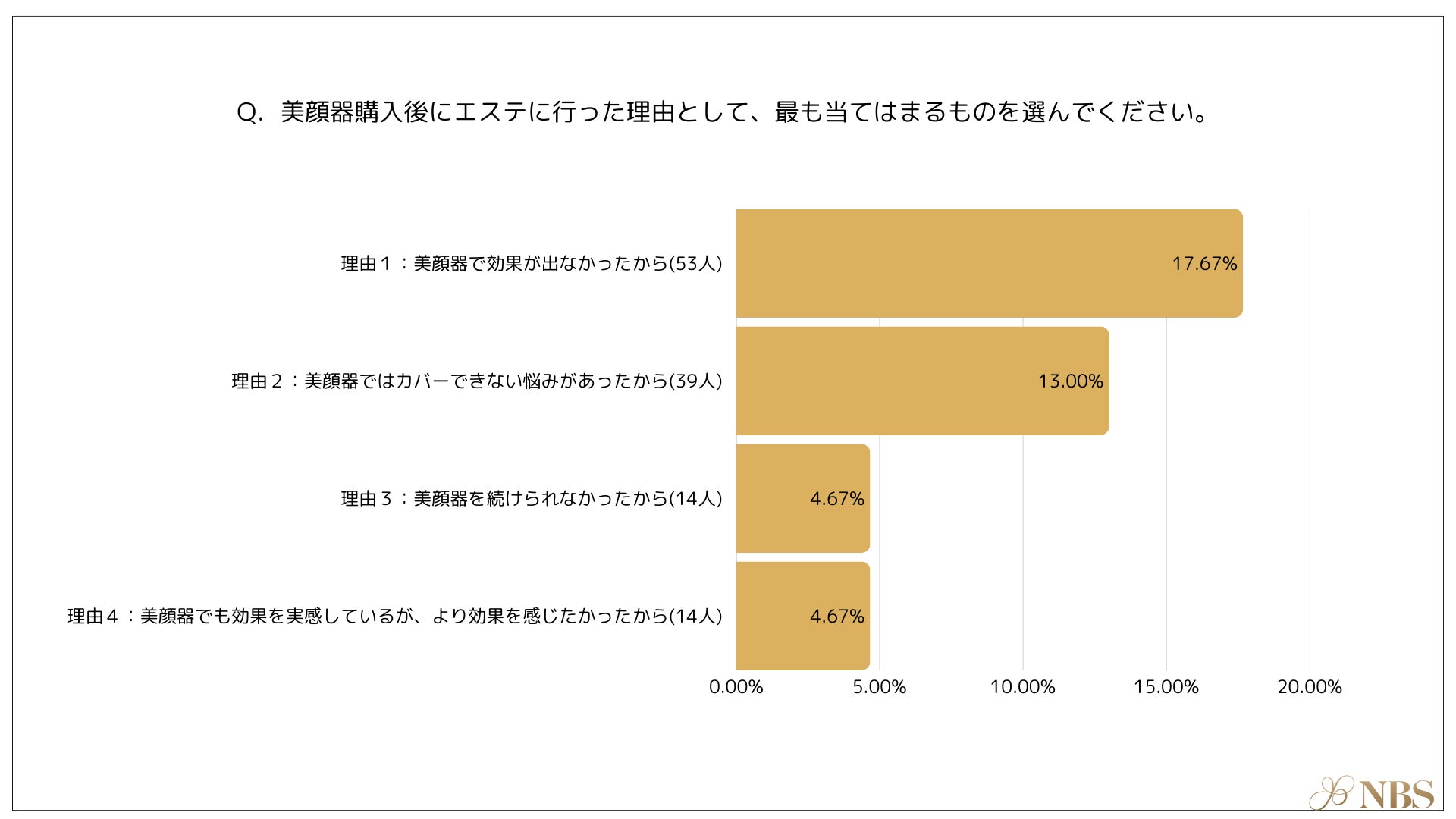 美顔器を購入後フェイシャルエステに行った理由として最も多かったのは、「美顔器で効果が出なかったから(17.67%)」、次いで「美顔器ではカバーできない悩みがあったから(13.00%)」、「美顔器を続けられなかったから(4.67%)」、「美顔器でも効果を実感しているが、より効果を感じたかったから(4.67%)」という結果となりました。