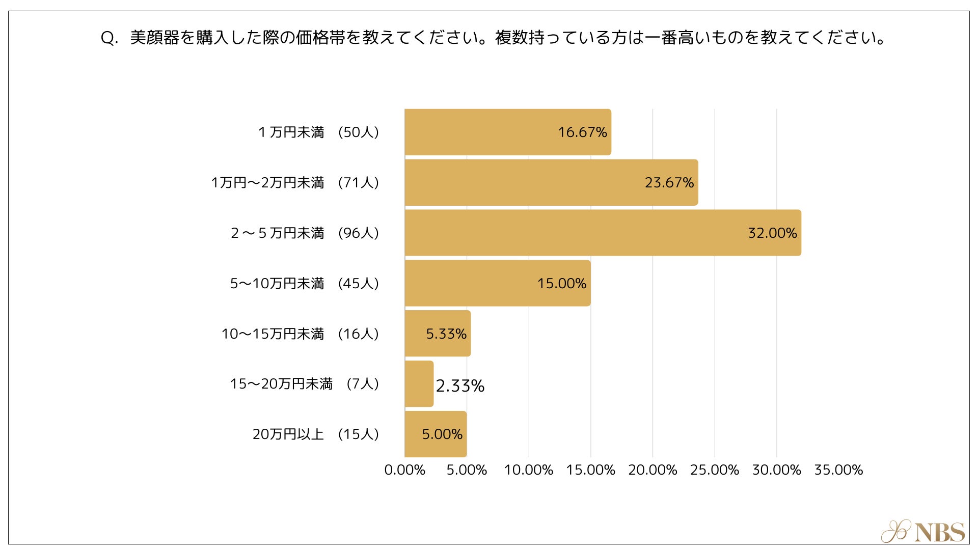 購入した美顔器の価格として最も多かったのは、「2~5万円未満(32.00%)」次いで「1万円~2万円未満(23.67%)」、「1万円未満(16.67%)」「5~10万円未満(15.00%)」という結果になりました。