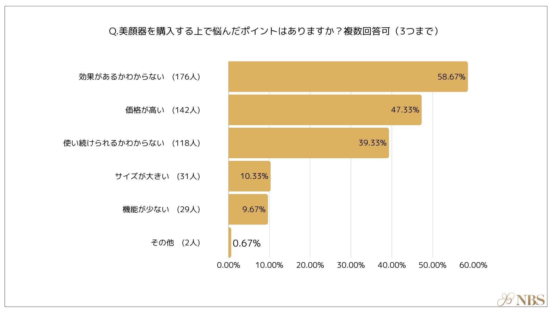 美顔器を購入する上で悩んだ点として最も多かったのは、「効果があるか分からない(58.67%)」次いで「価格が高い(47.33%)」、「使い続けられるか分からない(39.33%)」という結果になりました。
