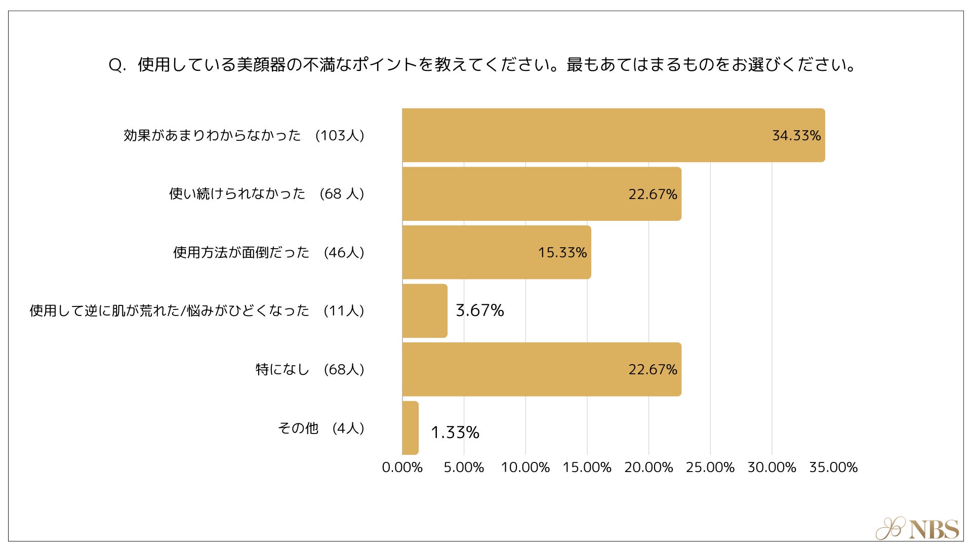 現在使用している美顔器の不満な点として最も多かったのは、「効果があまりわからなかった(34.33%)」次いで「使い続けられなかった(22.67%)」・「特になし(22.67%)」という結果になりました。