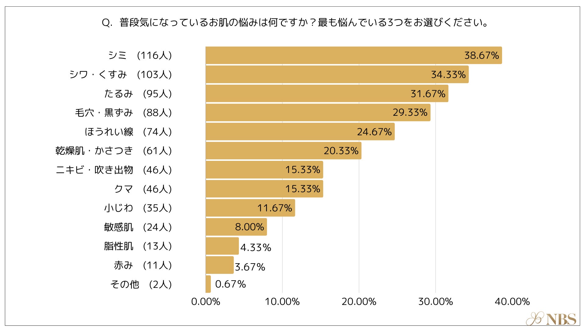 お肌の悩みで最も多かったのは「シミ(38.67%)」、次いで「シワ・くすみ(34.33%)」「たるみ(31.67%)」という結果となりました。その他にも、「毛穴・黒ずみ(29.33%)」「ほうれい線(24.67%)」「乾燥肌・かさつき(20.33%)」について、悩みがあることが分かります。