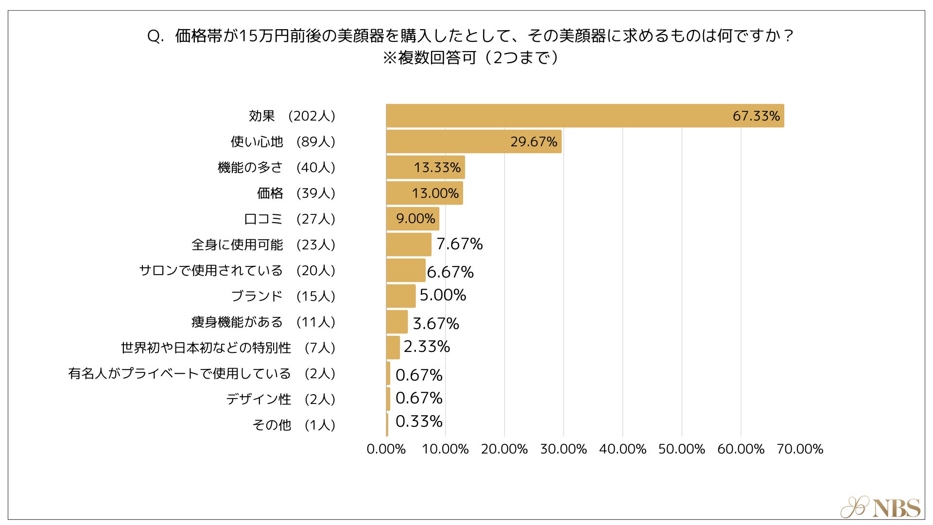 美顔器の価格帯が15万円前後であった場合、その美顔器に求めるものとして最も多かったのは、「効果(67.33%)」次いで「使い心地(29.67%)」「機能の多さ(13.33%)」という結果になりました。高価格帯の美顔器に対しては、より高い効果が求められていることが分かります。