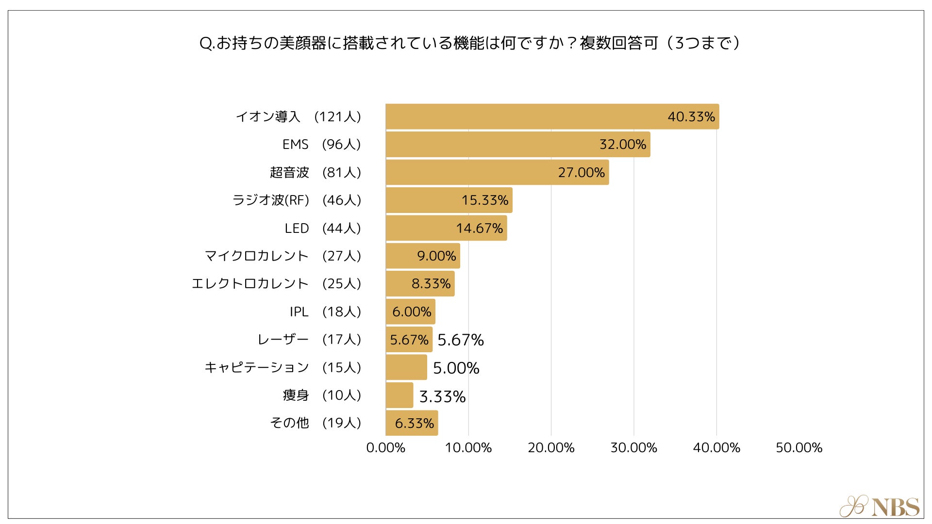 美顔器に搭載されている機能として最も多かったのは、「イオン導入(40.33%)」次いで「EMS(32.00%)」、「超音波(27.00%)」「ラジオ波(RF)(15.33%)」という結果になりました。